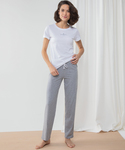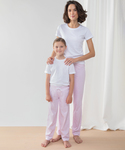 Relax in style with the soft and lightweight pyjama set featuring a white, comfortable loose fit t- shirt with contrast pants and matching drawcord bag. Available in attractive colourways.